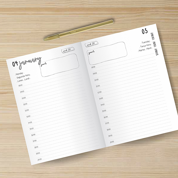 - Vista diária (um dia por página, fim de semana junto na mesma página)