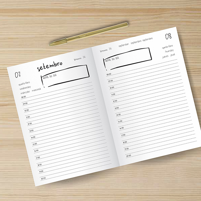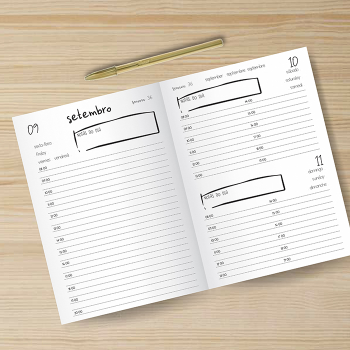 - Vista diária (um dia por página, fim de semana junto na mesma página)