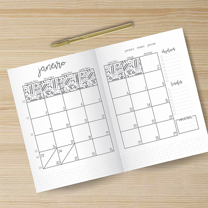 Miolo a preto, e páginas iniciais de cada mês a cores.