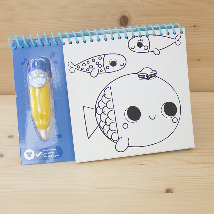 Cada bloco tem 6 desenhos para colorir e um pincel recarregável para encher com água.