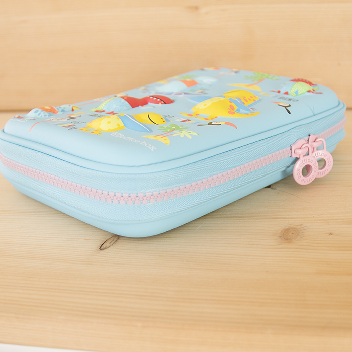 Estojo rígido 3D com desenhos de dinossauros no exterior.