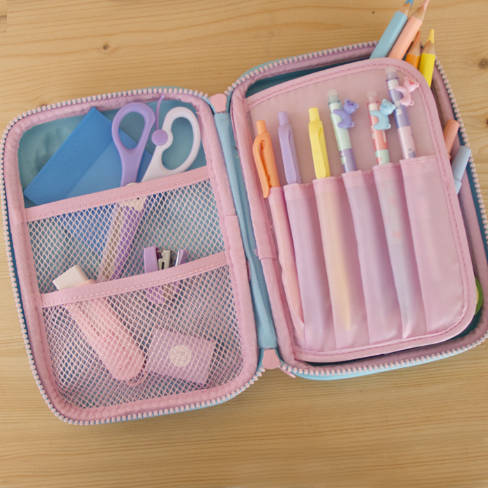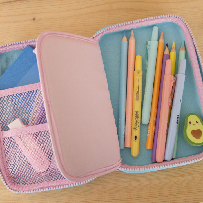 Interior com divisão a meio, permitindo guardar e organizar muitas canetas, lápis e acessórios.