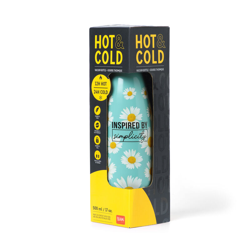 Garrafa térmica de 500ml (meio litro) com design maravilhoso, feita em aço inoxidável, reutilizável, com tampa hermética e uma pega removível em silicone.