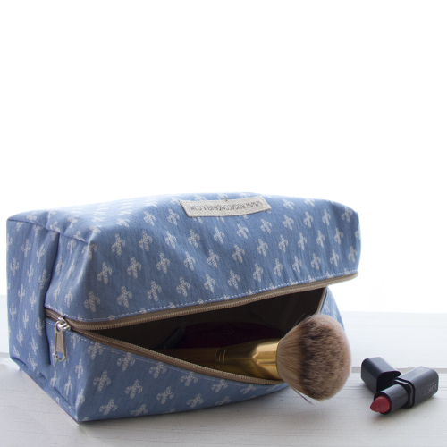 Nécessaire em tecido, com fecho éclair e alça.