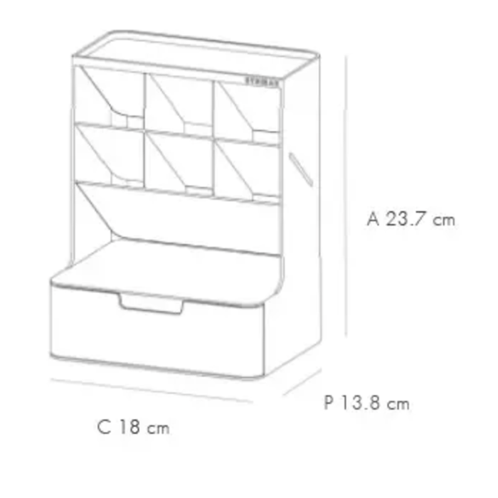 6 compartimentos pequenos, 1 grande e 1 gaveta na parte inferior