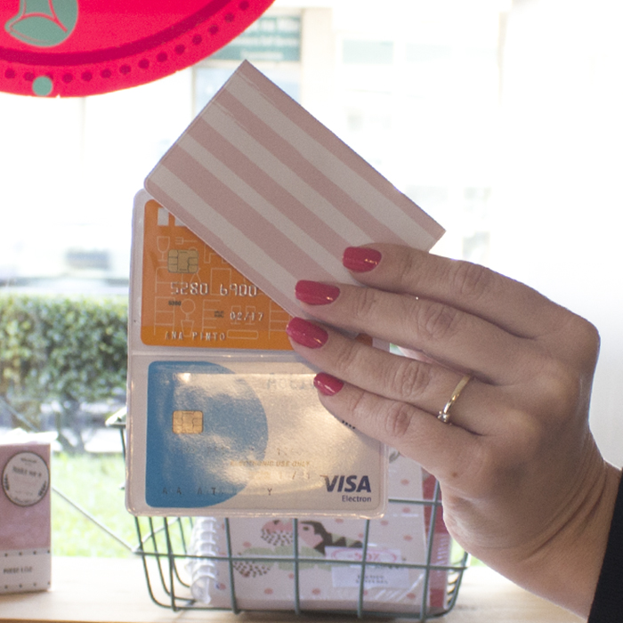 Plástico semi rígido e resistente, com 2 compartimentos no interior para inserir cartões.