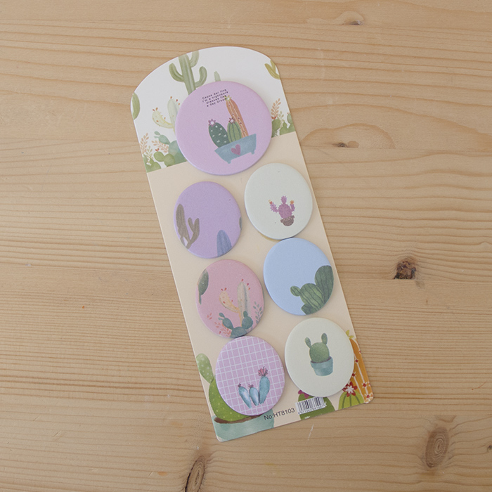 Sticky notes em papel, com tema de cactus, composto por 7 bloquinhos coloridos com padrões diferentes e redondos